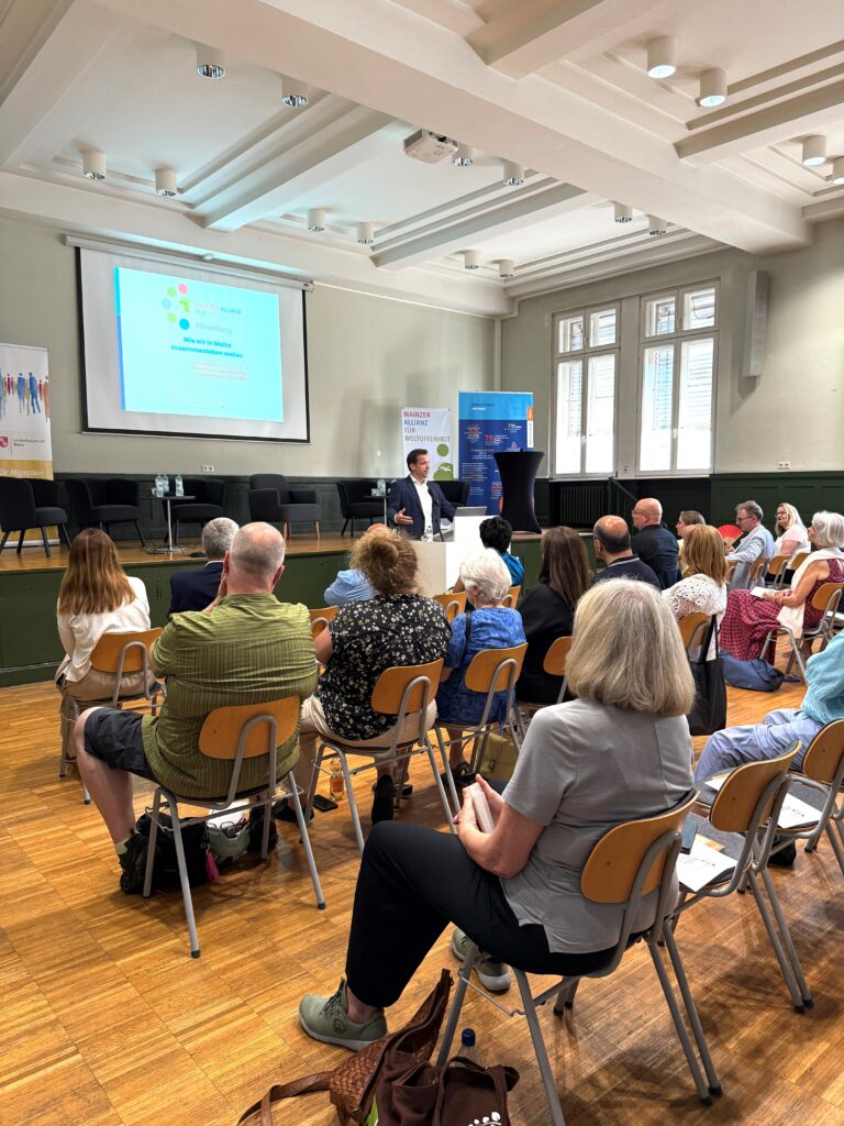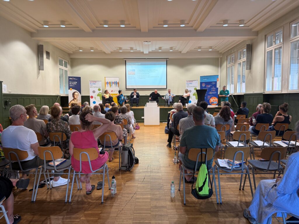 Unter dem Leitmotiv „Demokratie“ lud die vhs Mainz gemeinsam mit der Mainzer Allianz für Weltoffenheit zu einer gut besuchten Podiumsdiskussion ein. Die Allianz ist ein Bündnis aus engagierten Bürger:innen und Institutionen – darunter die vhs, der 1. FSV Mainz 05 und die Jüdische Kultusgemeinde.